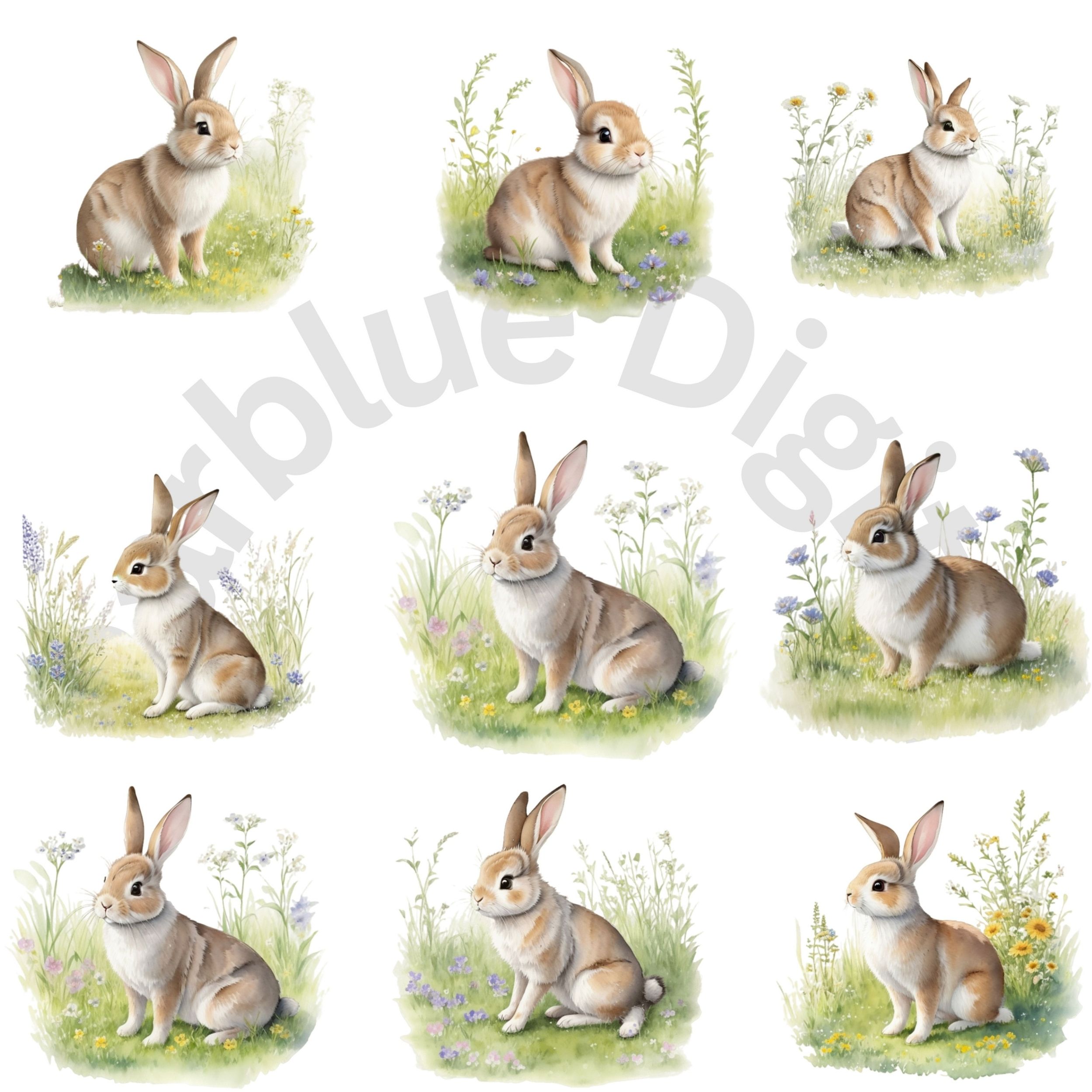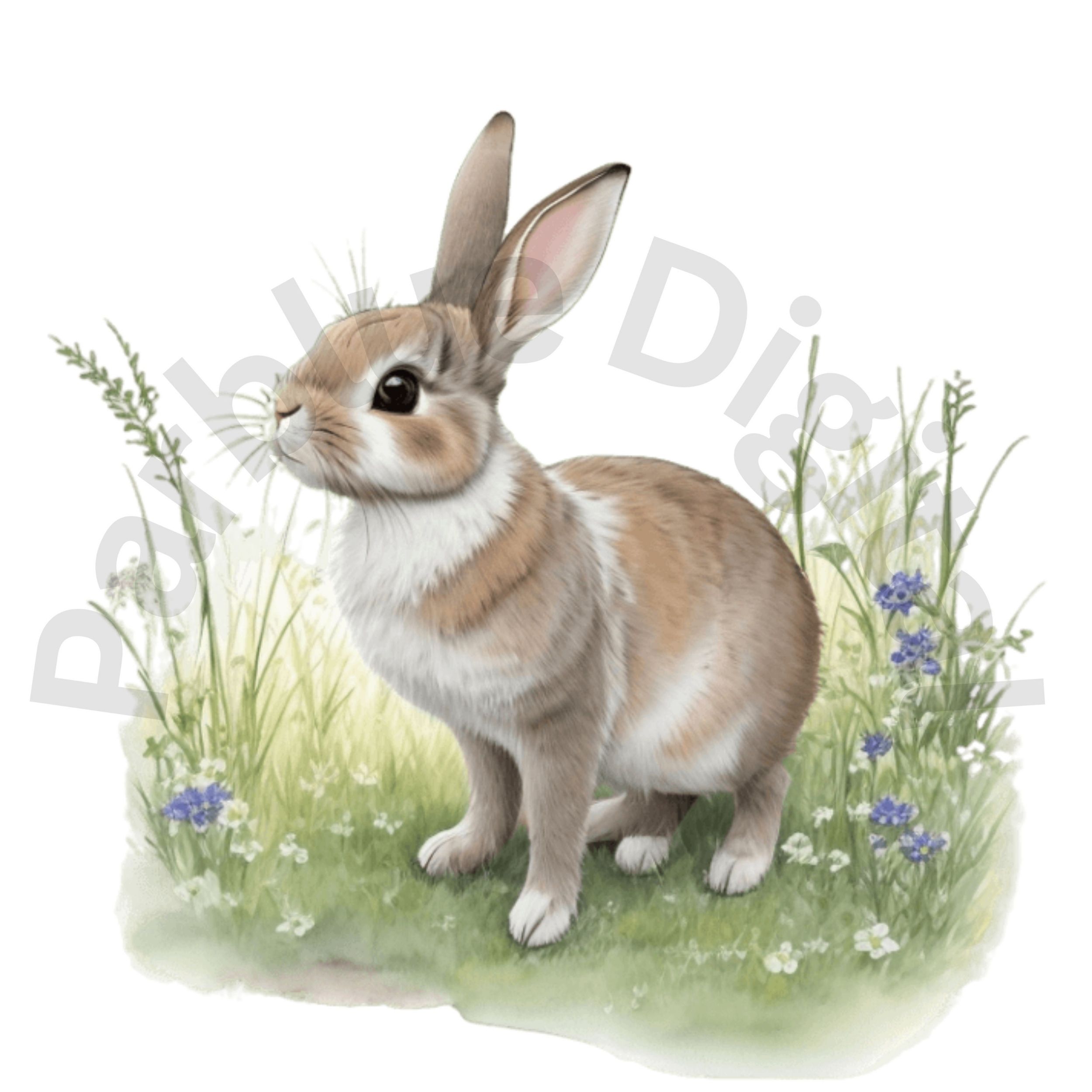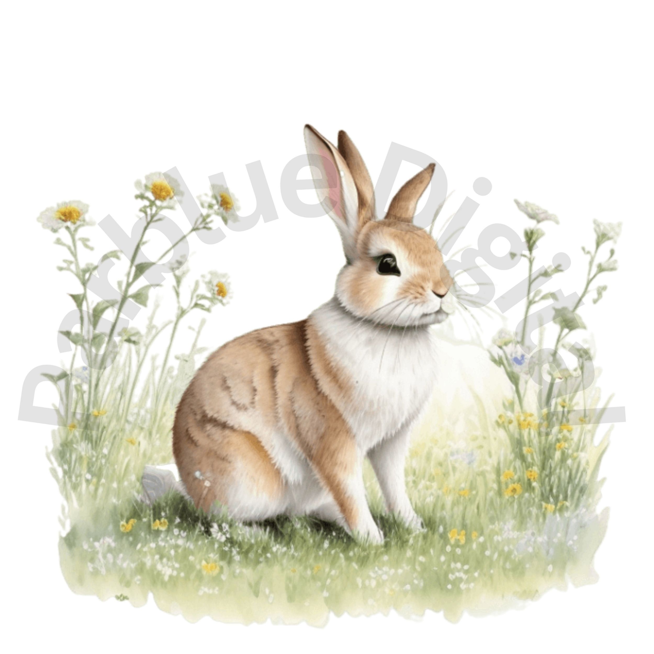 Digital Bunny in Meadow Clip Art,Instant Digital Download, Printable Watercolor Clip Art, High Quality PNG, Digital download, Paper Craft, Junk journals.