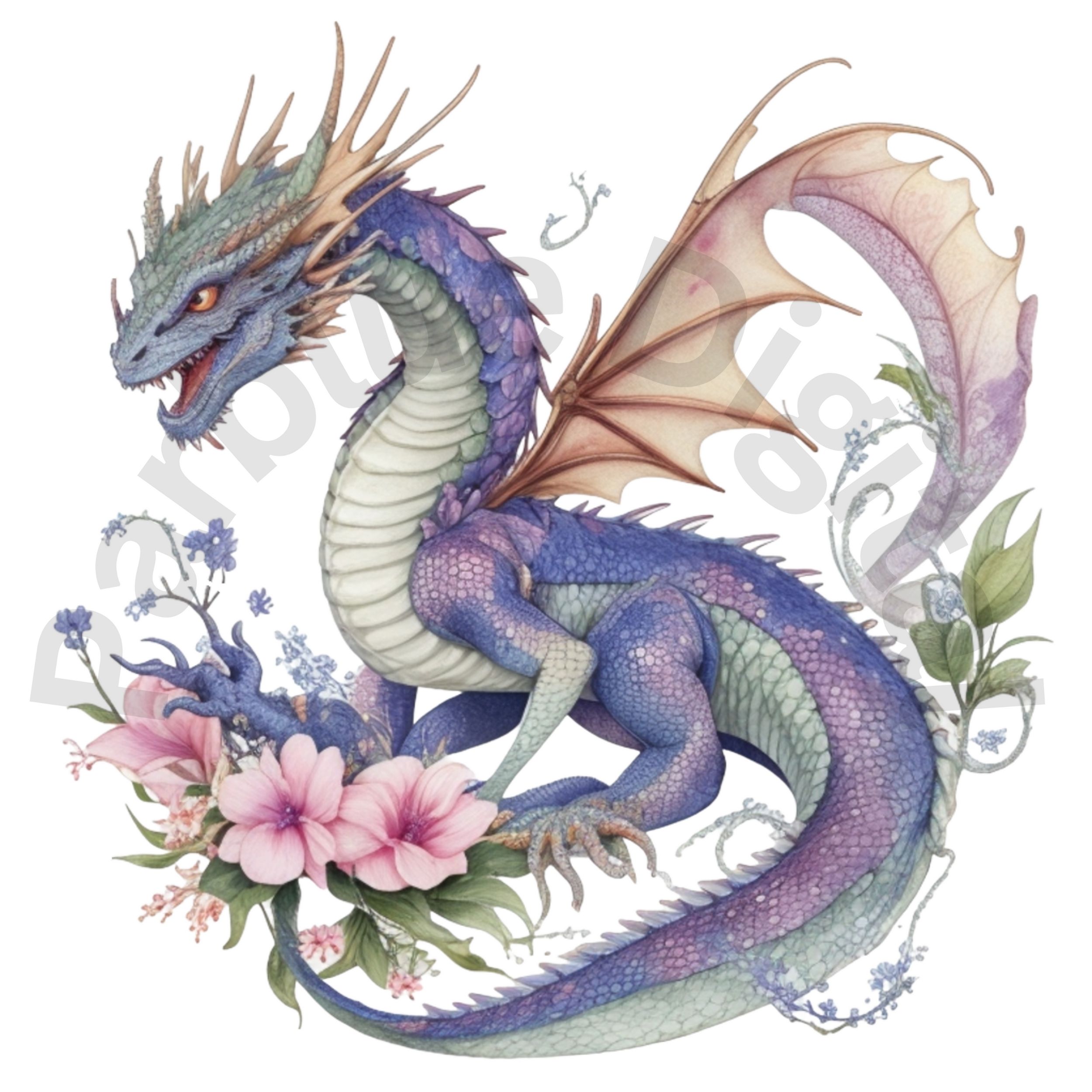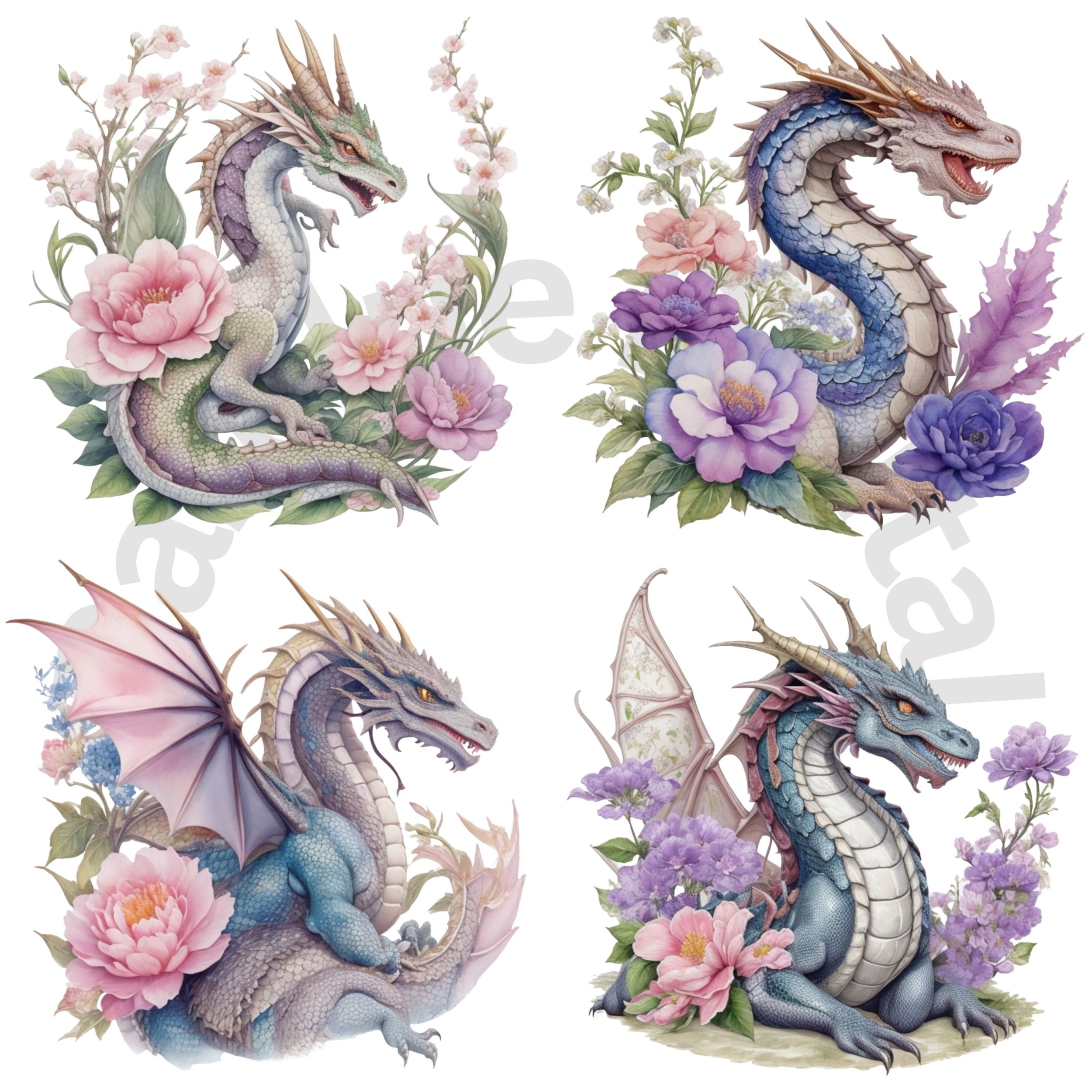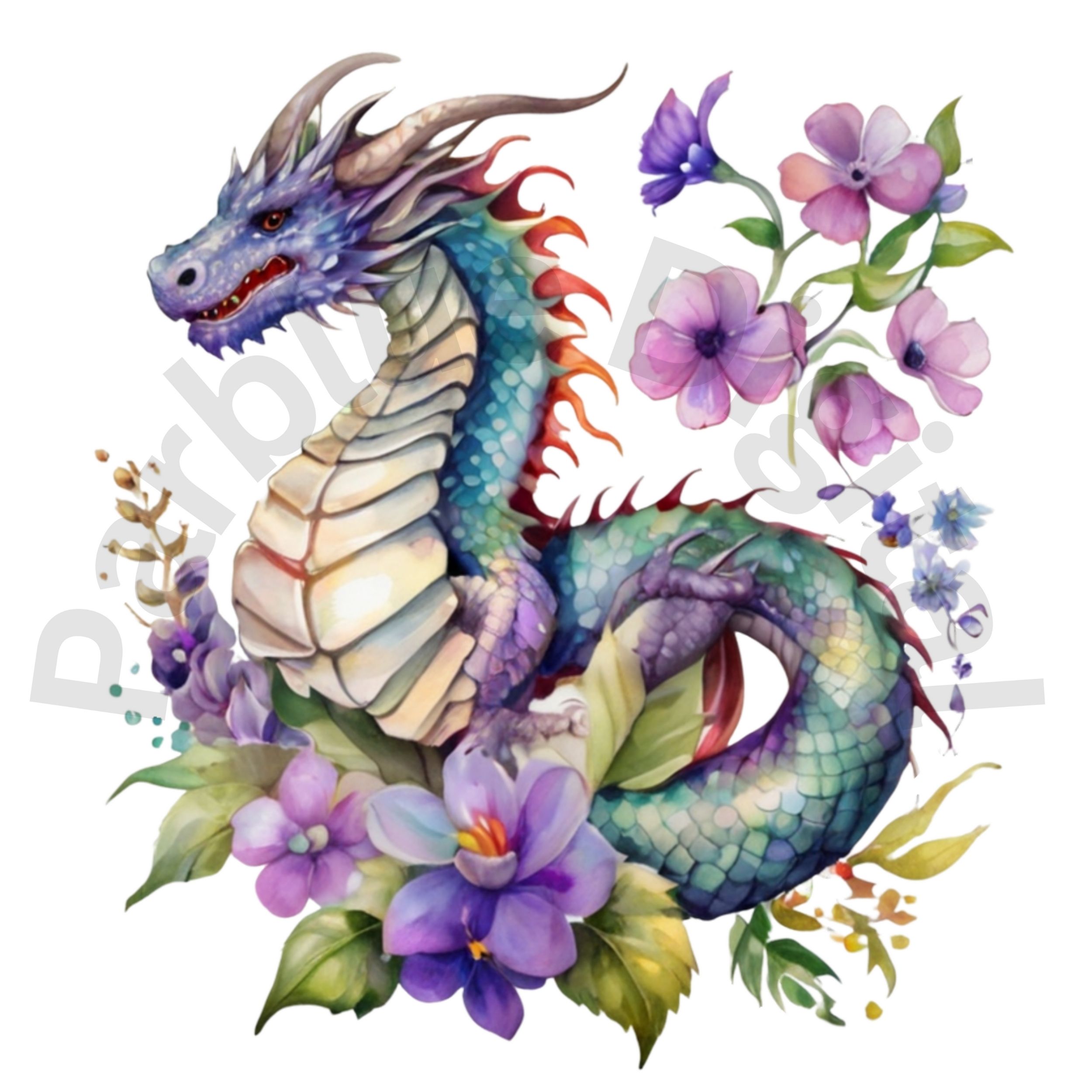 Digital Floral Dragon Clip Art,Instant Digital Download, Printable Watercolor Clip Art, High Quality PNG, Digital download, Paper Craft, Junk journals.