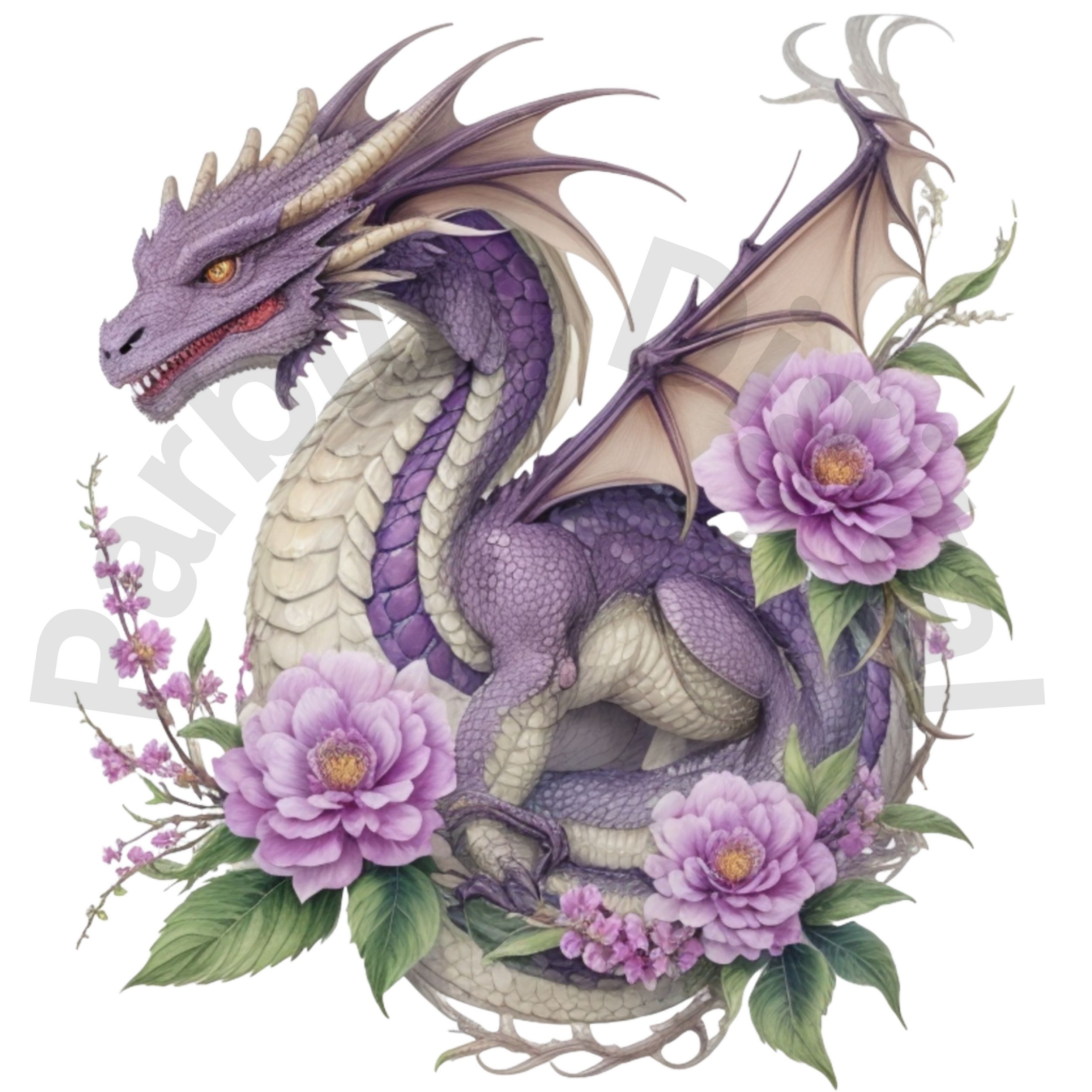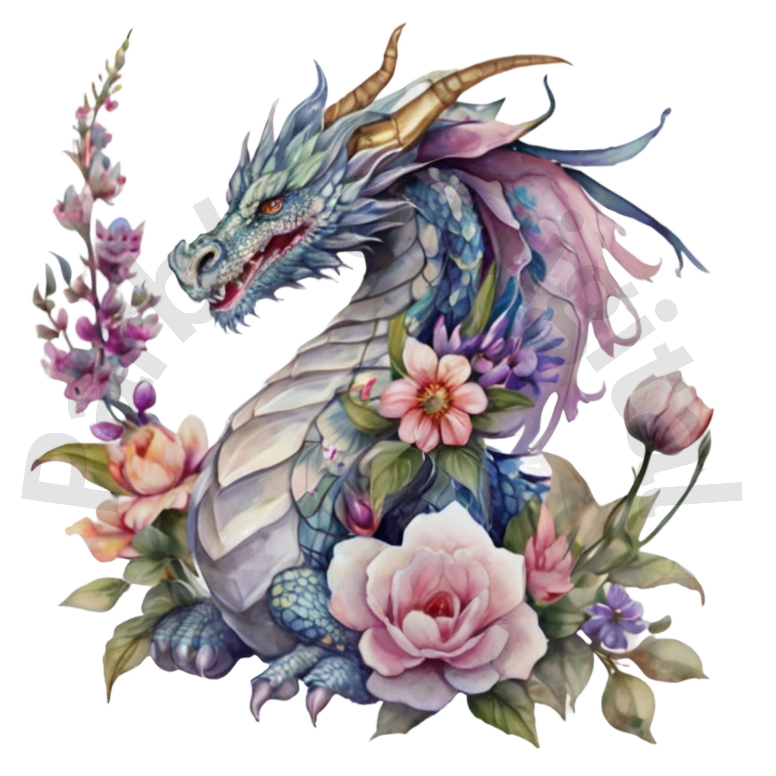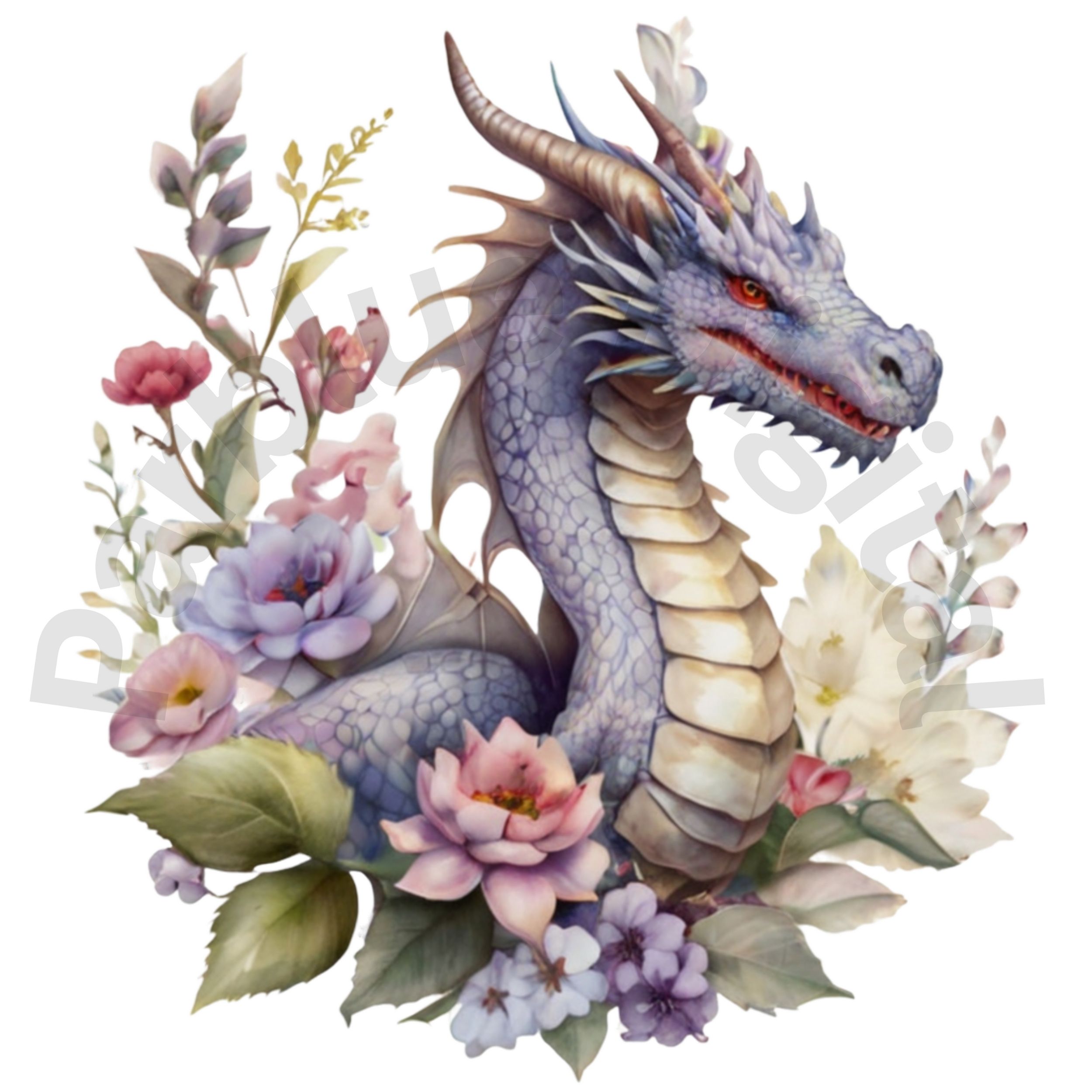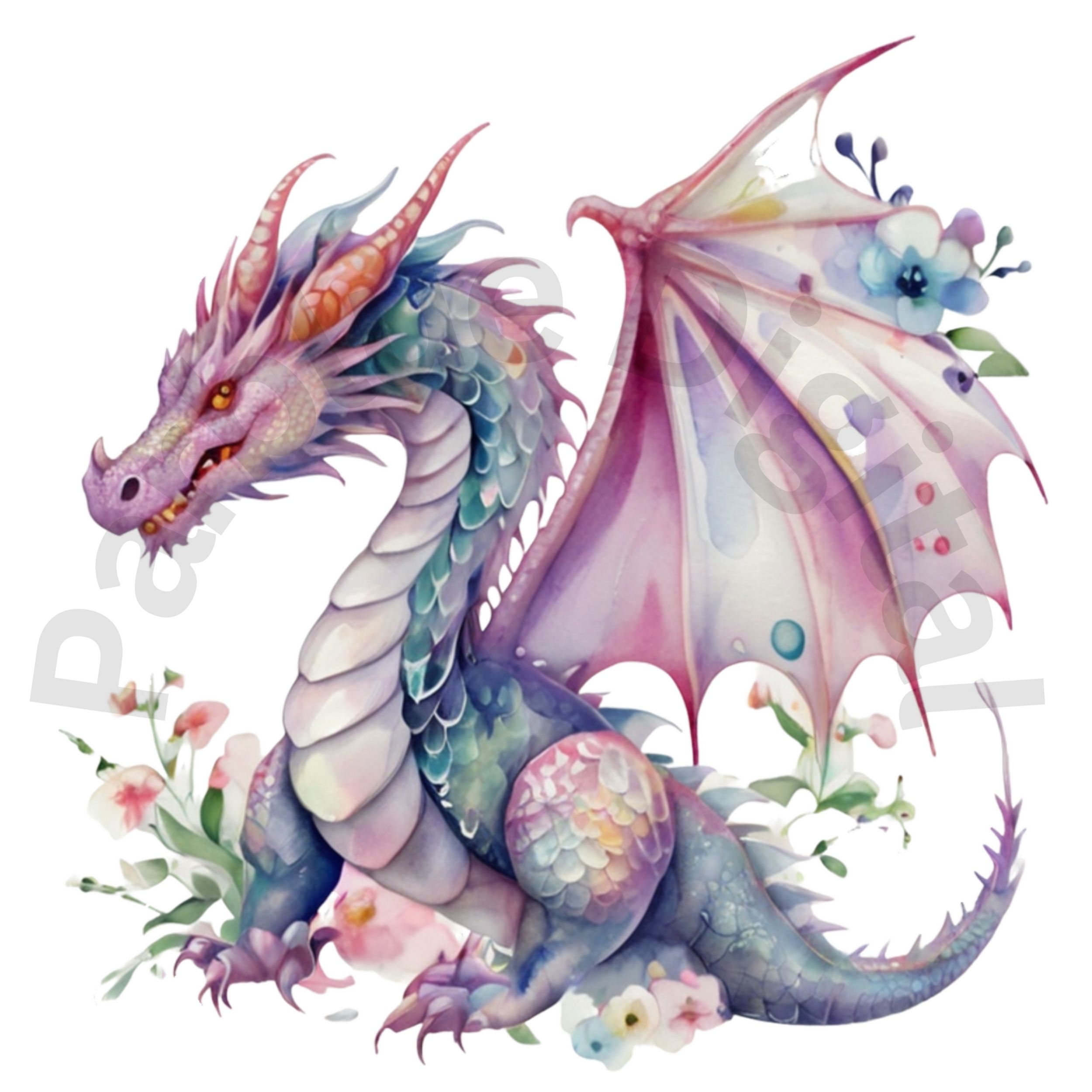 Digital Floral Dragon Clip Art,Instant Digital Download, Printable Watercolor Clip Art, High Quality PNG, Digital download, Paper Craft, Junk journals.